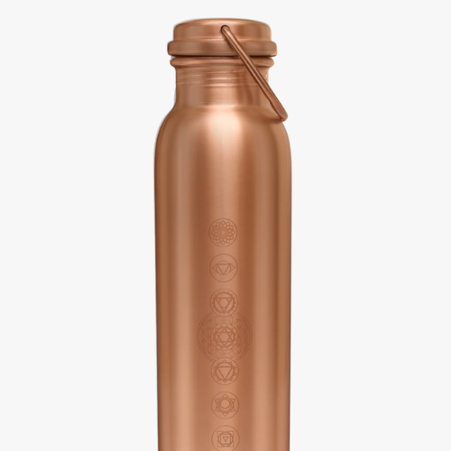 The Pure Copper Bottle - Chakra is a water bottle made entirely of copper. The design of the bottle includes symbols representing the chakras, which are energy centers in the body according to yoga and meditation traditions. It looks cool and unique with its shiny copper finish and chakra symbols.