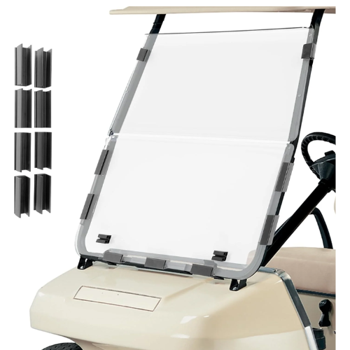 This Foldable Windshield for Club Car DS comes with a light transmittance of 93%, this golf cart windshield offers a clear and undistorted view, featuring anti-glare and UV protection. Made from 5mm thick acrylic, it is sturdy and shatter-resistant, ensuring durability and stability. The replacement windshield is foldable, providing ventilation in summer and wind protection in winter, making it ideal for all seasons.