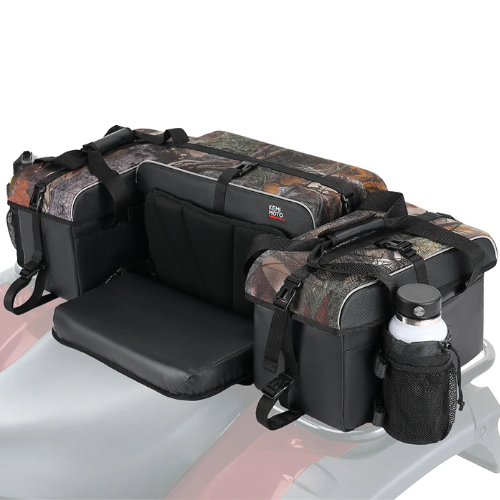 The ATV rear seat bag includes a soft, breathable cushion, providing a comfortable and secure seat for rear passengers. This cushion can be packed away using self-fastening straps when not in use. The bag`s TPU waterproof fabric and upgraded covered zippers prevent mud, water, and dust from entering, making cleaning easier and keeping your supplies pristine. The detachable three-piece design includes a removable cooler and cup holders, adding convenience and extra storage for personal items. Reflective strips enhance visibility at night, improving safety during low-light conditions.